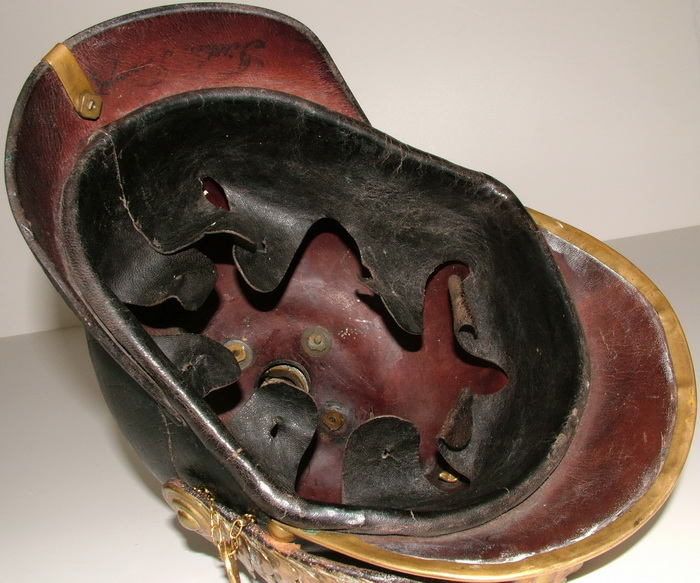 in der Ausführung vor 1927. Leider kann man ihn nicht direkt einem Regiment zuordnen, da er keinen Truppenstempel hat. Jedoch hat er handgeschrieben einen Trägernachweis auf dem Nackenschirm. Tillhör Trumpetare L. Hallström, 55 Der Helm gehört Trompeter L. Hallström, Nummer 55. |