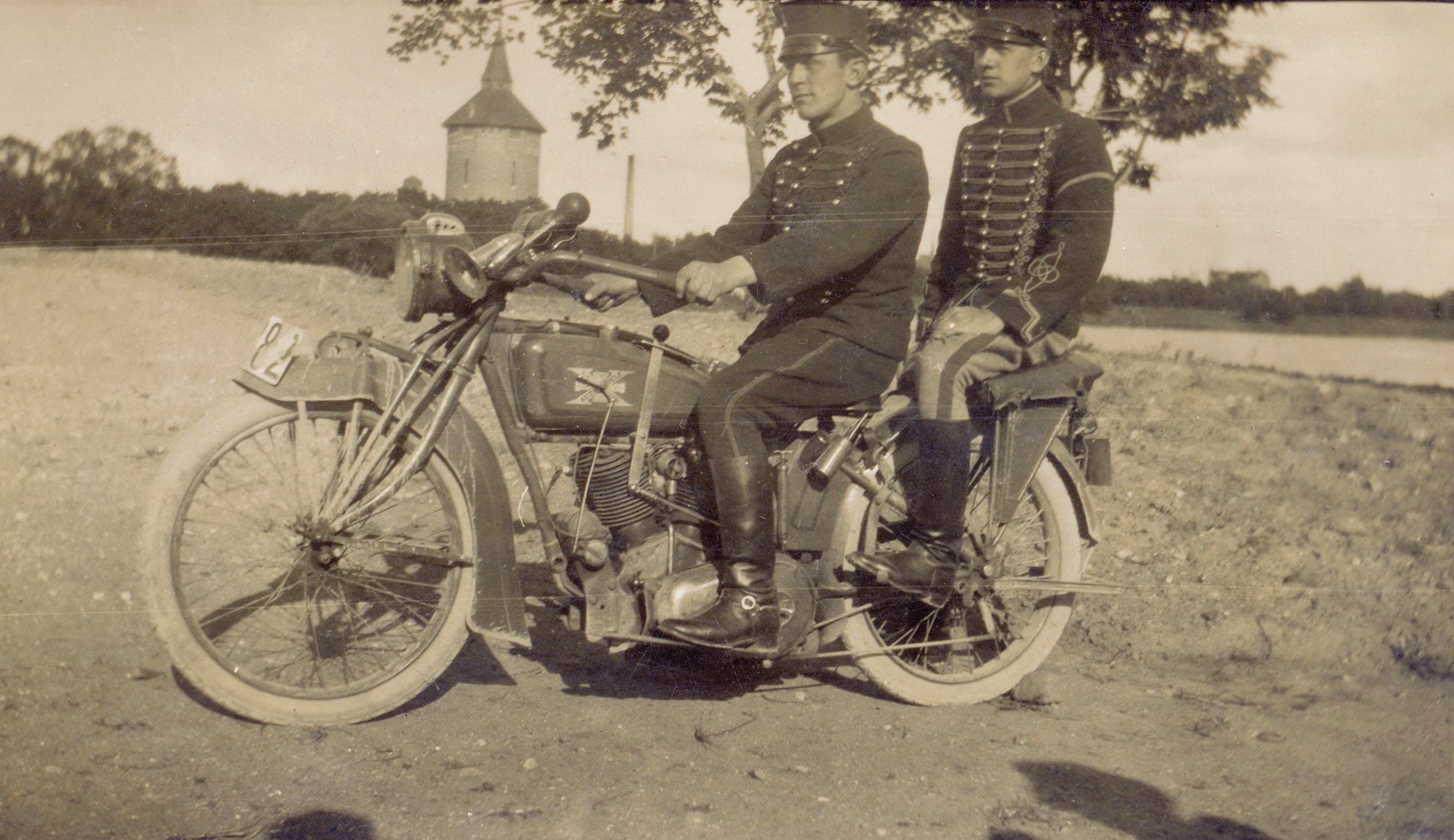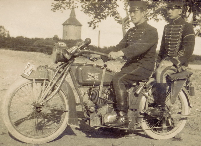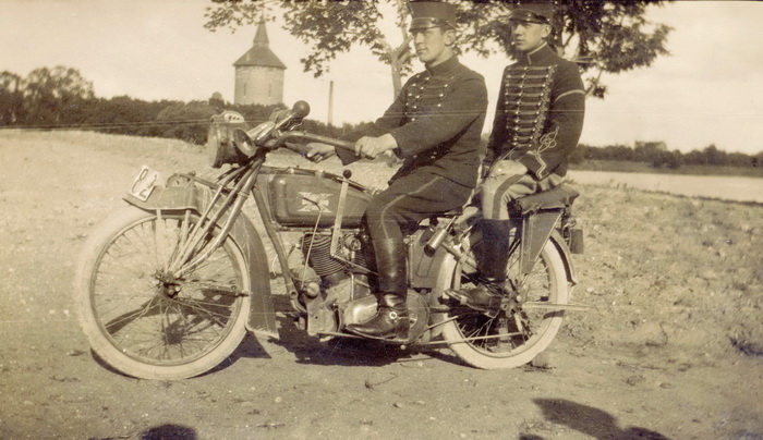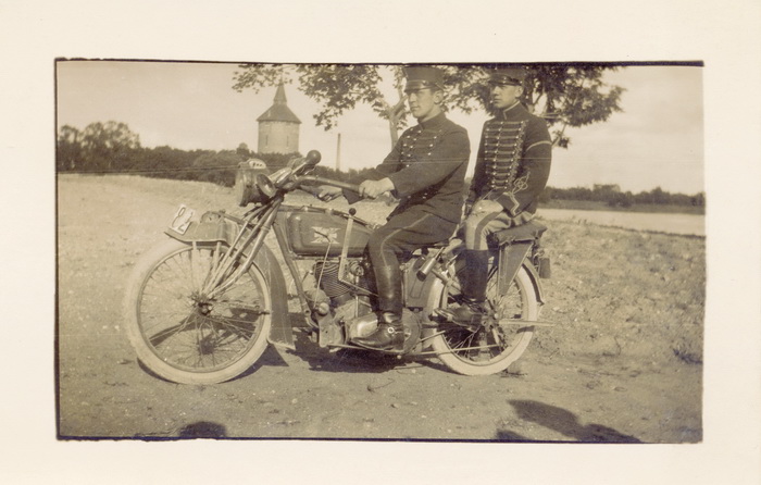 2 Skåne Husaren auf dem Motorrad nach 1910.